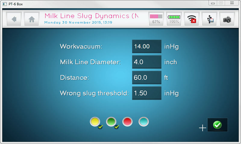 The Milk Line Dynamics App records slugs during cleaning of the Milking Installation and calculates the Duration of the Slug, Length of the Slug and Suggested Air Injection open time according to the NMC guidelines for Milk Line Slug Dynamics. Values are calculated according to the Work Vacuum, different Milk Line Diameters, Distance between the sensors and Wrong Threshold which can be entered manually before start of recording.